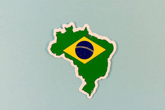 Brazil flag displayed on map outlines, a sticker pack. South America, country, nation, patriotic
