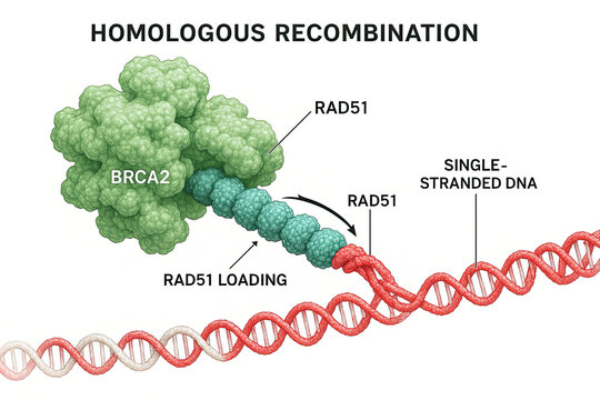 Illustration of Homologous Recombination Process with BRCA2 and RAD51 Proteins Interacting with DNA