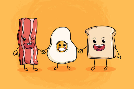 Cute breakfast bacon, egg and bread vector. Kawaii lunch character illustration