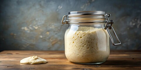 Glass jar filled with bubbling dough leaven for making homemade bread, yeast, leaven, dough, fermentation, bread making