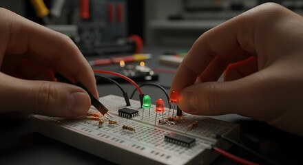 Hands carefully wiring electronic components on a breadboard for a science project, creating innovative technology with circuits and LEDs in a modern workshop