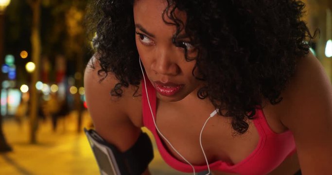 Close up of African American woman runner catching her breath on the street at night, Black female jogger taking a break from her run, 4k