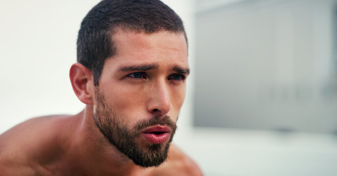 Tired, workout and breathing man for fitness training, cardio or outdoor running break at beach. Breathe, thinking and fatigue of athlete or sports person with exercise challenge in summer by ocean