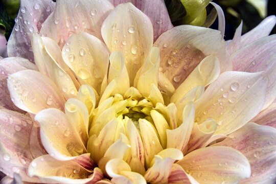 Informal decorative dahlia 'Break out' (Asteraceae) with water droplets on the petals, New York Botanical Garden; Bronx, New York, United States of America