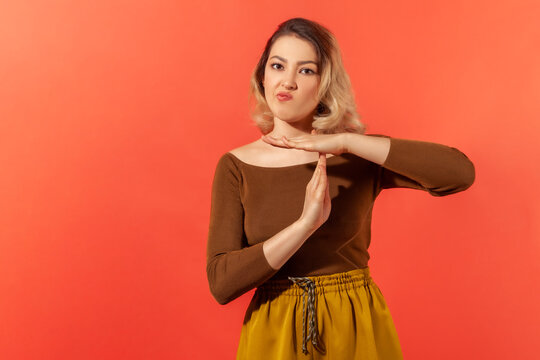 I need time out!Portrait of young upset woman want to take a rest or have a break and showing gesture of time out and asking for the pause. Indoor studio shot isolated on red background