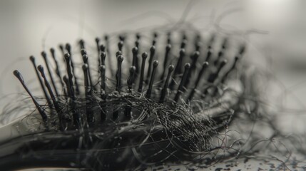 Hairbrush with tangled hair strands, hair loss concept.
