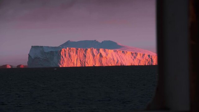 Arch in a huge iceberg, high breakaway glacier drifts in the southern ocean off the coast of Antarctica at sunset, the Antarctic Peninsula, the Southern Arctic Circle, azure water, cloudy weather