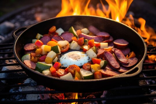 Big breakfast with bacon and scrambled eggs image in the dark background