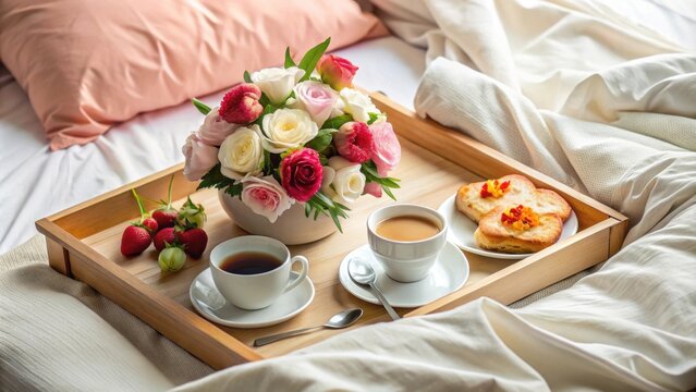 Romantic Breakfast Heart-Shaped Pancakes with Fresh Berries and Rose Bouquet for Valentine's Day