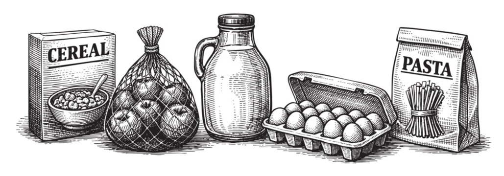 A black and white illustration of staple grocery items including cereal, apples, milk, eggs, and pasta, depicted in a vintage, hand-drawn style.