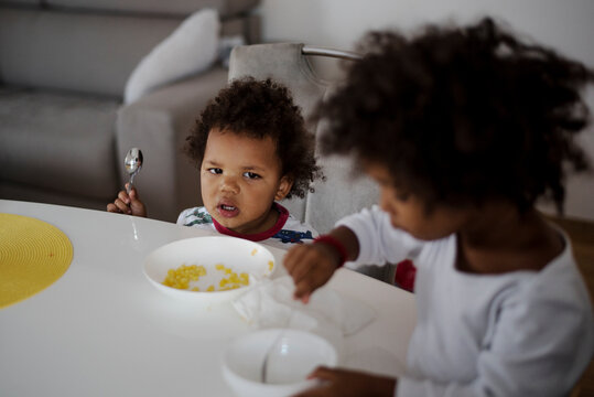 Father and his cute little son having fun during breakfast at table in kitchen