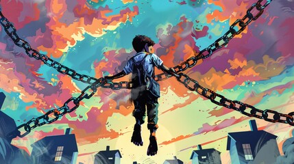 A woman walks forward, breaking free from chains, symbolizing liberation and strength with a dreamy, ethereal atmosphere