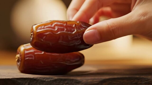 Close-up of a hand breaking the fast with dates on a wooden surface with warm tones.