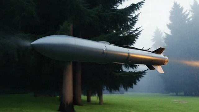 The missile races dense forest sleek body cutting trees at breakneck speed. low-altitude flight forest floor wildlife missile zooms by. dynamic angle, narrowly tree missile locks sudden surge of speed
