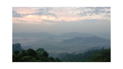 A tranquil sunrise over misty hills, where golden light gently breaks through the clouds, painting the sky above the lush forested valley.