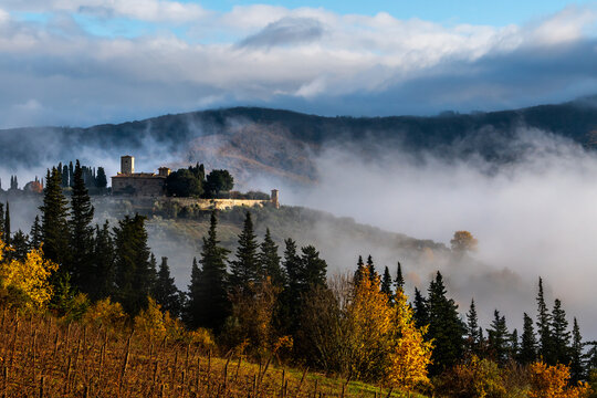 Castello di Colognole as sun breaks through early morning mist, Greve in Chianti, Tuscany, Italy
