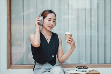 A young woman wearing headphones, holding a coffee cup, and relaxing by the window. She is dressed in casual modern fashion, enjoying a peaceful moment.