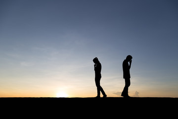 Silhouettes of couple man and woman broken heart at nature sunset. Love concept.