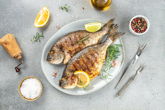 Raw gilt head bream vector illustration. Cartoon isolated whole fresh gilthead dorade fish of Mediterranean sea water, silver bream, seafood and aquatic animal for delicatessen restaurant menu
