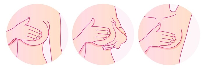 Part of female torso, woman doing self check of breasts and feeling pain. Self-examination. Breast pain illustration set. Tumour or cancer signs.  National breast cancer awareness month