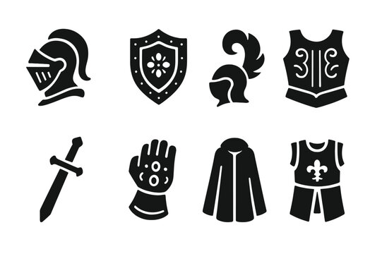 Ceremonial Armor Icons. Solid, filled icon set of ceremonial armor: ornamental helmet, decorative shield, plume, engraved breastplate, ceremonial sword,