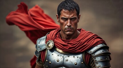 Roman emperor in detailed armor and red cape, standing authoritatively.