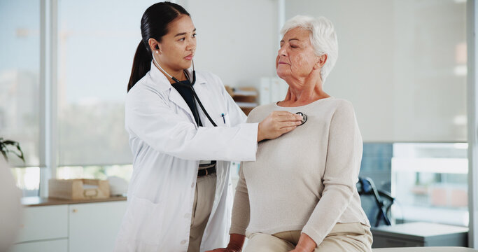 Senior woman, doctor and stethoscope at clinic, listening and cardiology with medical services. People, elderly patient and tools with healthcare, breathing test and lungs with assessment at hospital