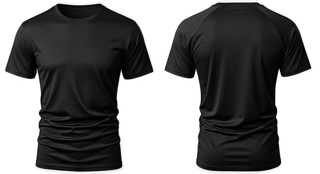 Front and back view of a black tshirt hanging on a wooden hanger against a textured wall