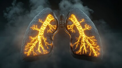 Anatomical illustration of lungs against a black background, depicting respiratory system details