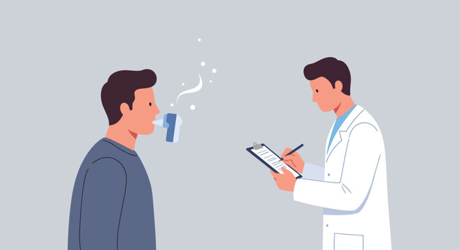 Respiratory health check-up Doctor monitors patient using an inhaler or spirometer for lung function test, assessing breathing and providing medical treatment