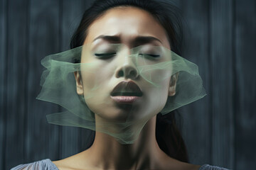 Young Asian woman with a transparent sheet or material covering their face.