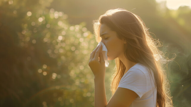 young woman outdoors, using a tissue, likely to address sneezing or a runny nose.