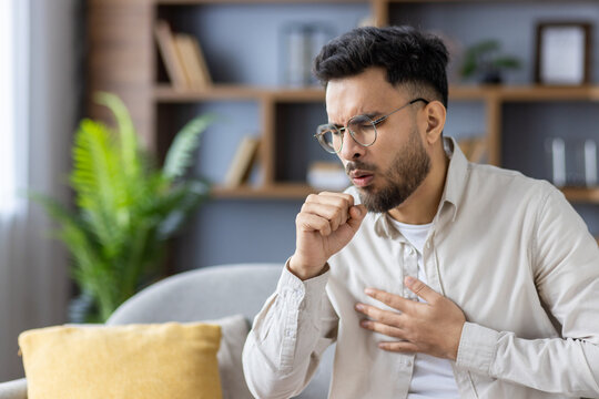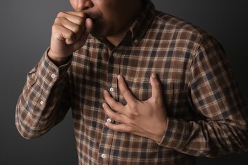 Photo of a man in a plaid shirt is coughing and holding his chest, indicating he is experiencing chest pain and respiratory issues