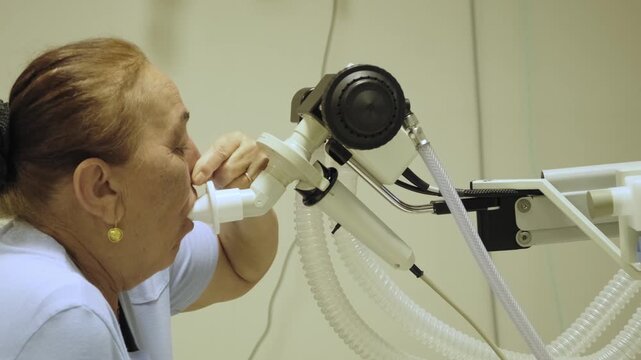 Senior woman sitting on park bench struggles with breathing. Image captures concern and health issues in tranquil natural environment. Depicts aging, respiratory problems, need for medical attention.