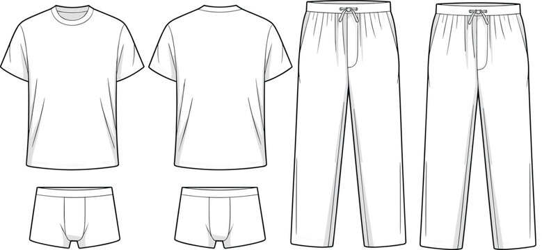 Men’s t-shirt briefs and lounge pants technical flat sketch front and back view, cad drawing vector for fashion design mockup