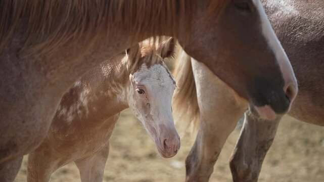 Young pony standing between adult horses in a pasture.