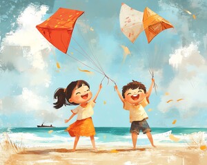 2D cartoon of Asian children flying kites at the beach, breezy sky, lighthearted scene, vibrant tones, laughter, dynamic poses, whimsical drawing style