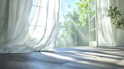 A sheer white curtain gently swaying by an open window on a breezy summer day.