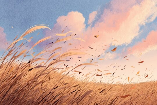 Breezy wind illustration over a sunlit meadow with swirling air ribbons