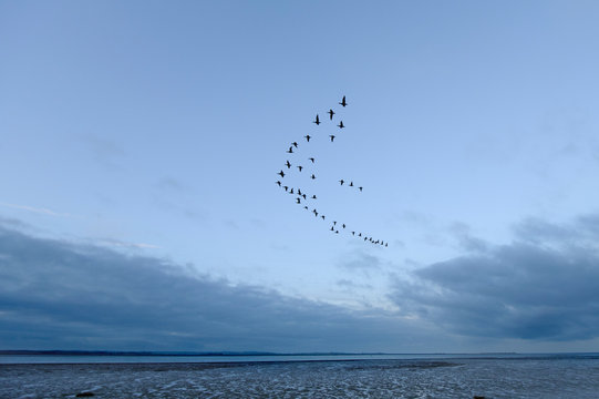 Flock of dark bellied brent geese flying against cloudy sky