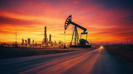 Oil pumps extracting crude oil at sunset, with a refinery in the background and a road in the foreground, creating a dramatic industrial scene