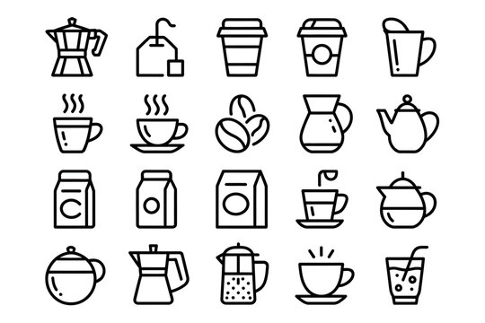 Collection of Coffee and Tea Iconography in Vector Format Representing Various Brewing Methods and Beverage Options with Modern Design