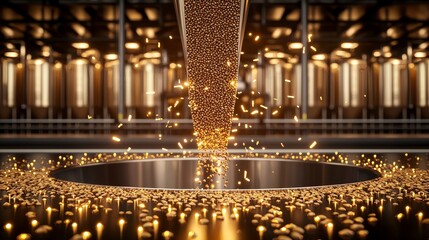 An artistic depiction of malt grains pouring into a metallic brew kettle, surrounded by ambient glowing lights and intricate reflections, capturing a modern brewery vibe