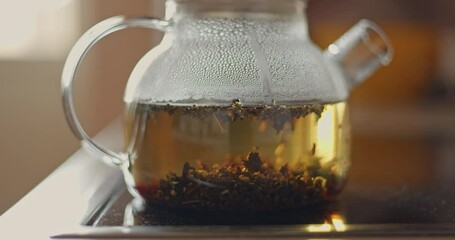 tea is brewed in a glass teapot, evaporation drops on the walls of the teapot