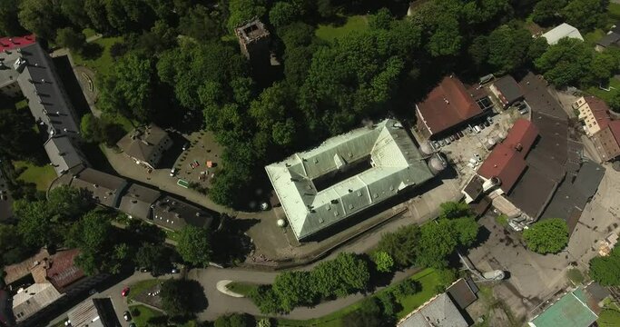 A building of an old brewery next to a park with a historic tower and a large number of green trees during summer in Poland, captured in a 4K bird's-eye view drone shot.