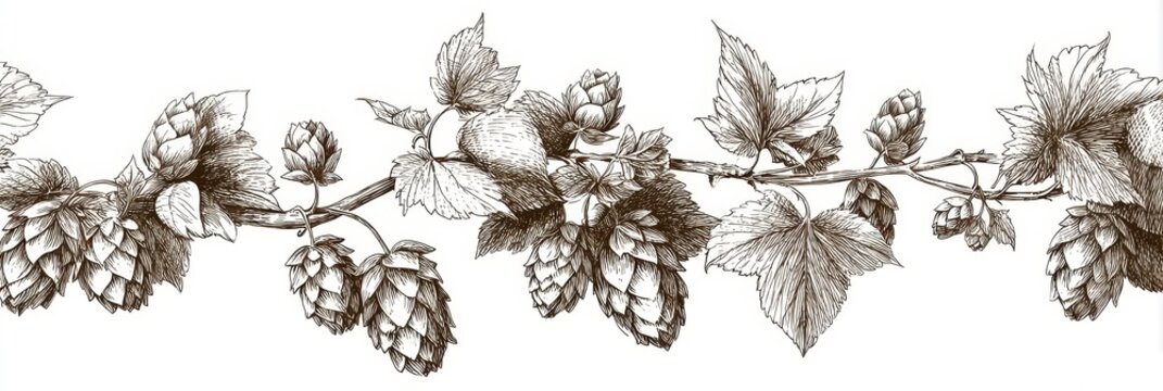 Hops Border. Vintage Hand-Drawn Sketch of Hops Plant with Leaves and Cones. Botanical Design Element for Beer Label
