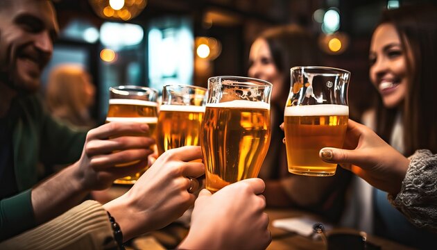 A group of friends clinking large beer steins, surrounded by Oktoberfest decorations