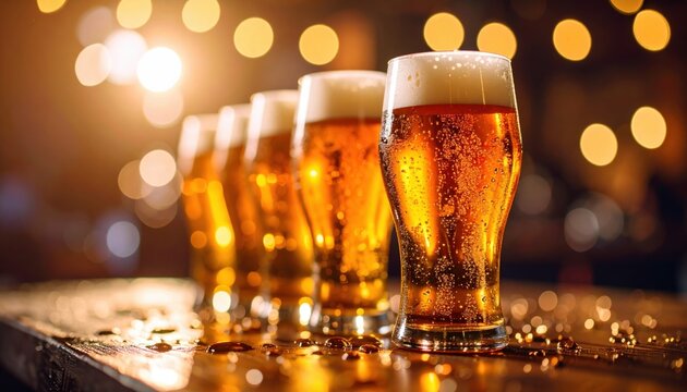 Refreshing beer glass on stylish bar counter modern lounge beverage photography warm ambient lighting close-up relaxation concept