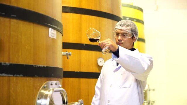 male winemaker expert in sterile suit working holding wine glass and inspects oat fermentation tanks to test the quality of the wine color, smell, taste of wine the wine factory