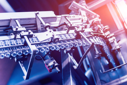 Industrial process of beverage production: beer bottles on conveyor belt in brewery